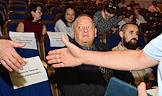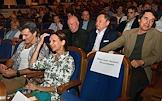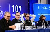 Пресс-конференция, посвященная открытию 107 сезона Московского академического Музыкального театра им. К.С. Станиславского и Вл. И. Немировича-Данченко (МАМТ), на Основной сцене театра. Люди театра во время пресс-конференции.