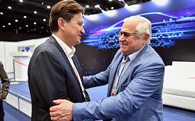 Международная выставка автомобильной промышленности "Авто+Автомеханика Санкт-Петербург" в КВЦ "Экспофорум". Председатель совета директоров БН-Моторс Алексей Подщеколдин (слева) и руководитель дирекции развития проектной деятельности Фонда "Росконгресс" Слава Ходько (справа) во время форума.