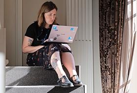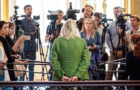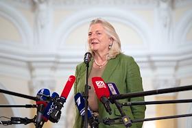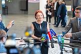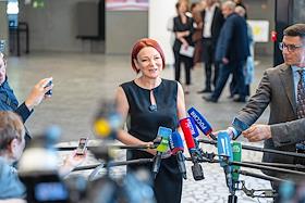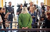 XI Санкт-Петербургский международный форум объединенных культур. Панельная дискуссия "Цивилизационный диалог России и Запада" в Гатчинском дворце на территории Государственного историко-художественного дворцово-паркового музея-заповедника "Гатчина". Руководитель центра G.O.R.K.I (Геополитическая обсерватория по ключевым проблемам России) Санкт-Петербургского государственного университета Карин Кнайсль во время общения с журналистами после окончания сессии.
