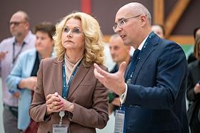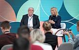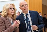 XI Санкт-Петербургский международный форум объединенных культур. Итоговая сессия под председательством заместителя председателя правительства России Татьяны Голиковой. Заместитель председателя правительства России Татьяна Голикова (слева) и генеральный директор Информационного агентства России ТАСС Андрей Кондрашов (справа) перед началом сессии.