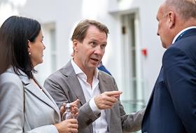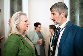 XI Санкт-Петербургский международный форум объединенных культур. Панельная дискуссия "Цивилизационный диалог России и Запада" в Гатчинском дворце на территории Государственного историко-художественного дворцово-паркового музея-заповедника "Гатчина". Директор консерватории имени С. В. Рахманинова в Париже Арно Фрилле (справа) и руководитель центра G.O.R.K.I (Геополитическая обсерватория по ключевым проблемам России) Санкт-Петербургского государственного университета, бывший министр иностранных дел Австрии Карин Кнайсль (слева) на сессии.
