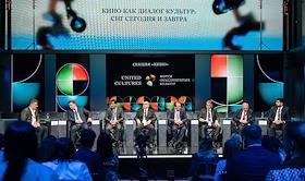 XI Санкт-Петербургский международный форум объединенных культур. Панельная дискуссия "Кино как открытый диалог культур: СНГ сегодня и завтра" Слева направо: ведущий программы "Индустрия кино", заместитель генерального директора АО "Цифровое Телевидение", директор по киноканалам Иван Кудрявцев, исполнительный директор Фонда кино Федор Соснов, временно исполняющим обязанности президента киностудии "Казахфильм" имени Шакена Айманова Айдар Омаров, директор киностудии "Беларусьфильм" Дмитрий Семенов, председатель Союза кинематографистов Киргизской Республики, режиссер Таалайбек Кулмендеев, председатель киностудии "Объединение "Туркменфильм" имени Огузхана" Мамметназар Сапармырадов, первый заместитель директора государственного учреждения "Таджикфильм" Толиб Рахматуллоев и директор Центра развития национальной кинематографии Узбекистана Фуркат Усманов во время пленарной дискуссии.
