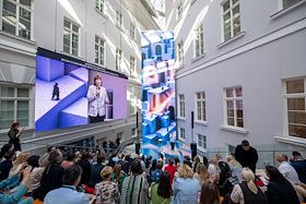 XI Санкт-Петербургский международный форум объединенных культур. Сессия "Нейрореальность. Искусственный интеллект в кинопроизводстве" в Малом атриуме Главного штаба Эрмитажа. Директор института анимации и цифровых технологий, декан факультета анимации и мультимедиа ВГИК Елена Яременко (на экране) во время сессии.