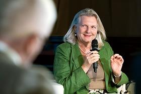 XI Санкт-Петербургский международный форум объединенных культур. Панельная дискуссия "Цивилизационный диалог России и Запада" в Гатчинском дворце на территории Государственного историко-художественного дворцово-паркового музея-заповедника "Гатчина". Руководитель центра G.O.R.K.I (Геополитическая обсерватория по ключевым проблемам России) Санкт-Петербургского государственного университета Карин Кнайсль на сессии.