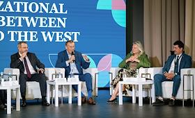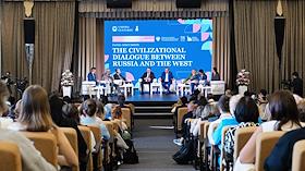 XI Санкт-Петербургский международный форум объединенных культур. Панельная дискуссия "Цивилизационный диалог России и Запада" в Гатчинском дворце на территории Государственного историко-художественного дворцово-паркового музея-заповедника "Гатчина". Слева направо: заместитель министра науки и высшего образования России Константин Могилевский, губернатор Ленинградской области Александр Дрозденко, руководитель центра G.O.R.K.I (Геополитическая обсерватория по ключевым проблемам России) Санкт-Петербургского государственного университета, бывший министр иностранных дел Австрии Карин Кнайсль и директор Института всеобщей истории РАН Михаил Липкин на сессии.