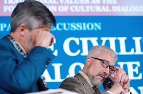 XI Санкт-Петербургский международный форум объединенных культур. Панельная дискуссия "Цивилизационный диалог России и Запада" в Гатчинском дворце на территории Государственного историко-художественного дворцово-паркового музея-заповедника "Гатчина". Директор консерватории имени С. В. Рахманинова в Париже Арно Фрилле (слева) и руководитель Федерального агентства по делам Содружества Независимых Государств, соотечественников, проживающих за рубежом, и по международному гуманитарному сотрудничеству (Россотрудничество) Евгений Примаков (справа) на сессии.