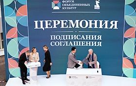 XI Санкт-Петербургский международный форум объединенных культур. Церемония подписания меморандума о взаимопонимании между Государственным Эрмитажем и Компанией Artworks (Республика Корея) в Главном штабе Государственного Эрмитажа. Генеральный директор компании Artworks Ю Мин Сок (второй справа) и директор Государственного Эрмитажа Михаил Пиотровский (справа) во время церемонии.