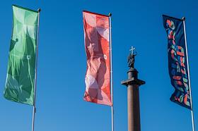 XI Санкт-Петербургский международный форум объединенных культур. Жанровая фотография. Флаги и бронзовая скульптура Ангела на Александровской колонне на Дворцовой площади.
