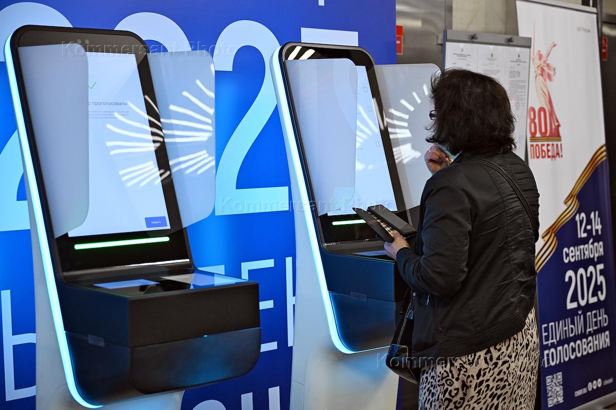 Выборы 2025. Единый день голосования. Выборы глав 19 регионов России через терминалы электронного голосования в вестибюле станции метро "Курская" Арбатско-Покровской линии. Избиратели во время голосования.