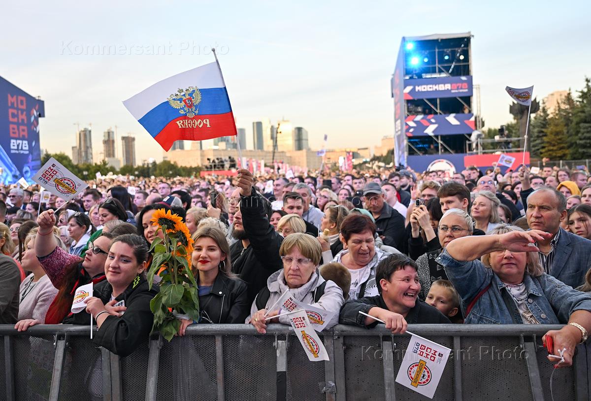 День города в Москве. Праздничные мероприятия, посвященные 878-й годовщине основания города, в парке Победы на Поклонной горе. Концерт звезд "Дорожного радио" "С днем рождения, Москва!". Зрители на концерте.