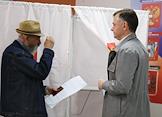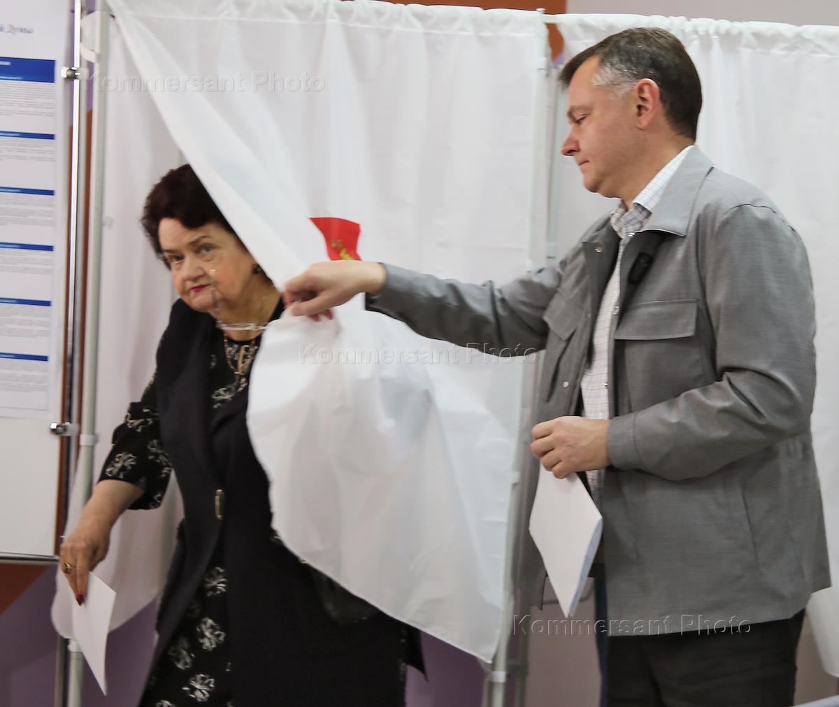 Единый день голосования 2025 в Ростове-на-Дону. Выборы губернатора Ростовской области. Временно исполняющий обязанности губернатора Ростовской области Юрий Слюсарь (справа) во время голосования на избирательном участке №1698.