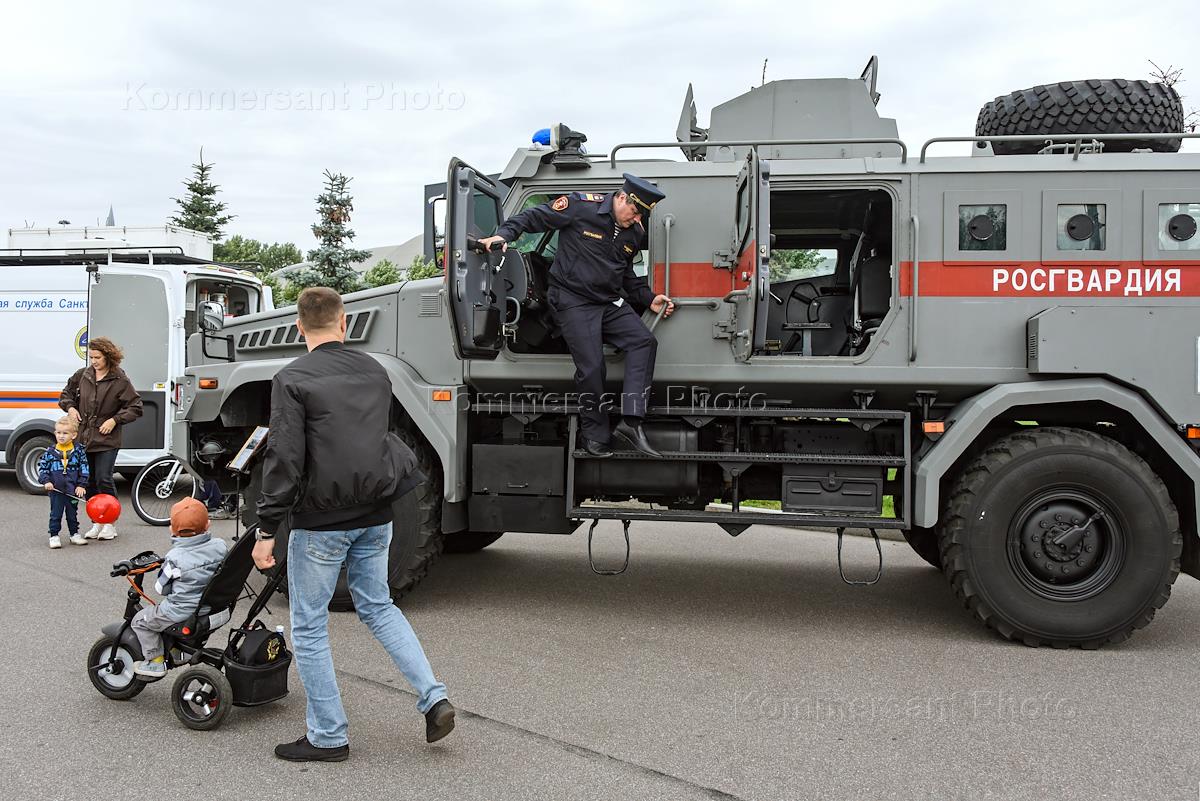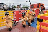 Финал соревнований по скоростному маневрированию на пожарных автомобилях "Трасса 1" у "Газпром Арены". Жанровая фотография. Площадка с выставочными зонами и активностями.