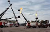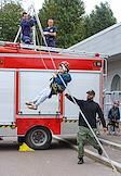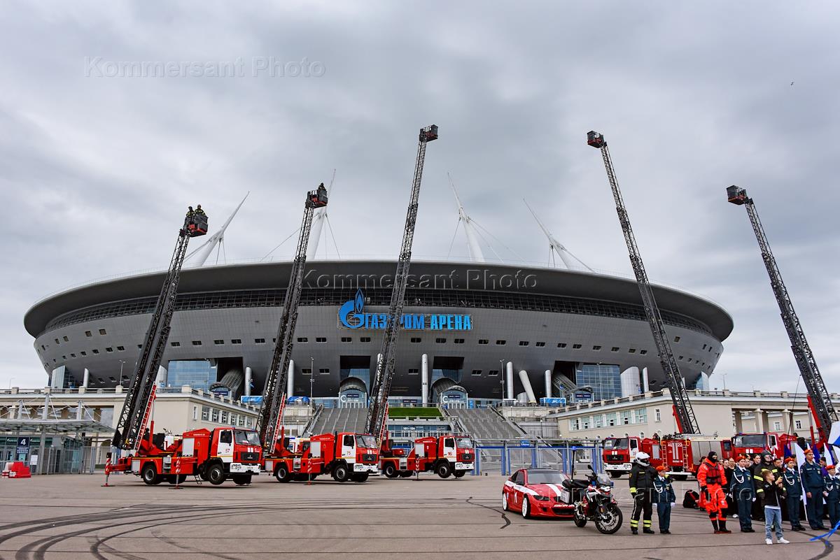 Финал соревнований по скоростному маневрированию на пожарных автомобилях "Трасса 1" у "Газпром Арены". Жанровая фотография. Выставка пожарной техники на площади у "Газпром Арены".