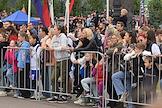 Финал соревнований по скоростному маневрированию на пожарных автомобилях "Трасса 1" у "Газпром Арены". Жанровая фотография. Зрители на торжественной церемонии открытия соревнований.