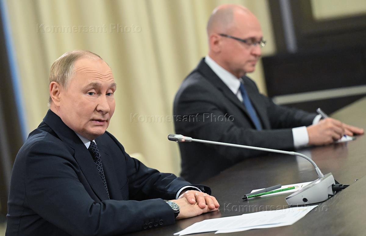 Встреча президента России Владимира Путина с лидерами парламентских фракций в Государственной думе (ГД) России в резиденции Ново-Огарево. Президент России Владимир Путин (слева) и первый заместитель руководителя Администрации президента России Сергей Кириенко (справа) во время встречи.