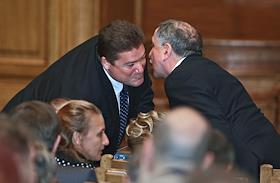Губернатор Калининградской области Георгий Боос (слева) и полномочный представитель Президента России в Северо-Западном федеральном округе Илья Клебанов (справа) во время заседании II — ого Всемирного конгресса соотечественников, проживающих за рубежом, с участием Президента России Владимира Путина. Конгресс прошел в Таврическом дворце.