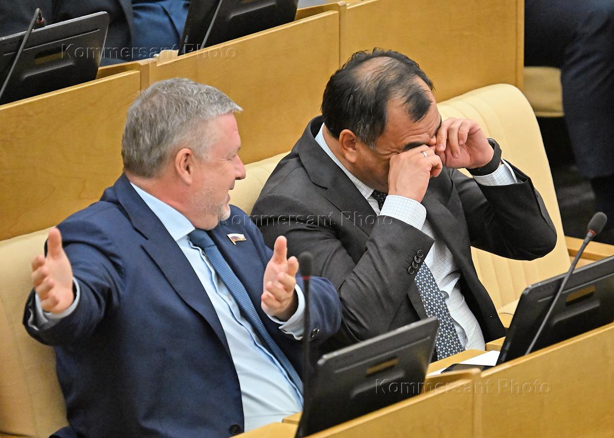 Пленарное заседание Государственной думы (ГД) России. Председатель комитета ГД России по труду, социальной политике и делам ветеранов Ярослав Нилов (слева) и член комитета ГД России по государственному строительству и законодательству Александр Тетердинко (справа) во время заседания.
