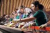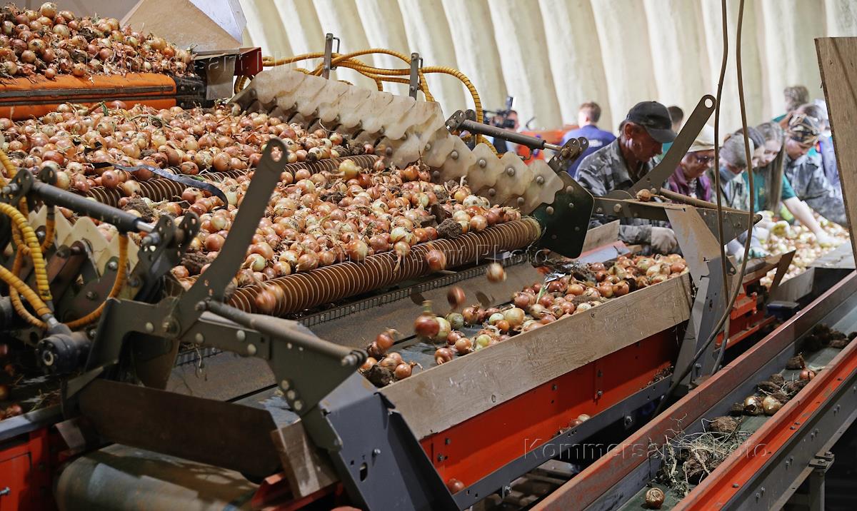 Уборка урожая лука на полях агропредприятия "Русь" в Волгоградской области. Жанровая фотография. Сортировка лука.