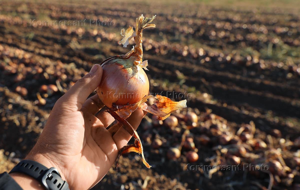 Уборка урожая лука на полях агропредприятия "Русь" в Волгоградской области. Жанровая фотография.