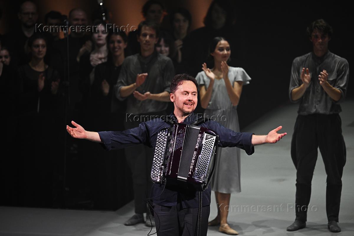 The MuzArts ballet project "Planida" on the stage of the State Academic Maly Theater. The one-act ballet "Russian Character" based on the novel by writer Alexei Tolstov, with music by Aidar Gainullin, choreographed by Pavel Glukhov. Accordionist and composer Aidar Gainullin after the ballet.