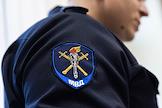 Вынесение меры пресечения для топ-менеджеров "Облкоммунэнерго" и АО "Объединенная теплоснабжающая компания" (ОТСК) в Верх-Исетском районном суде. Жанровая фотография. Нашивка с надписью "МВД" на форме сотрудника полиции.