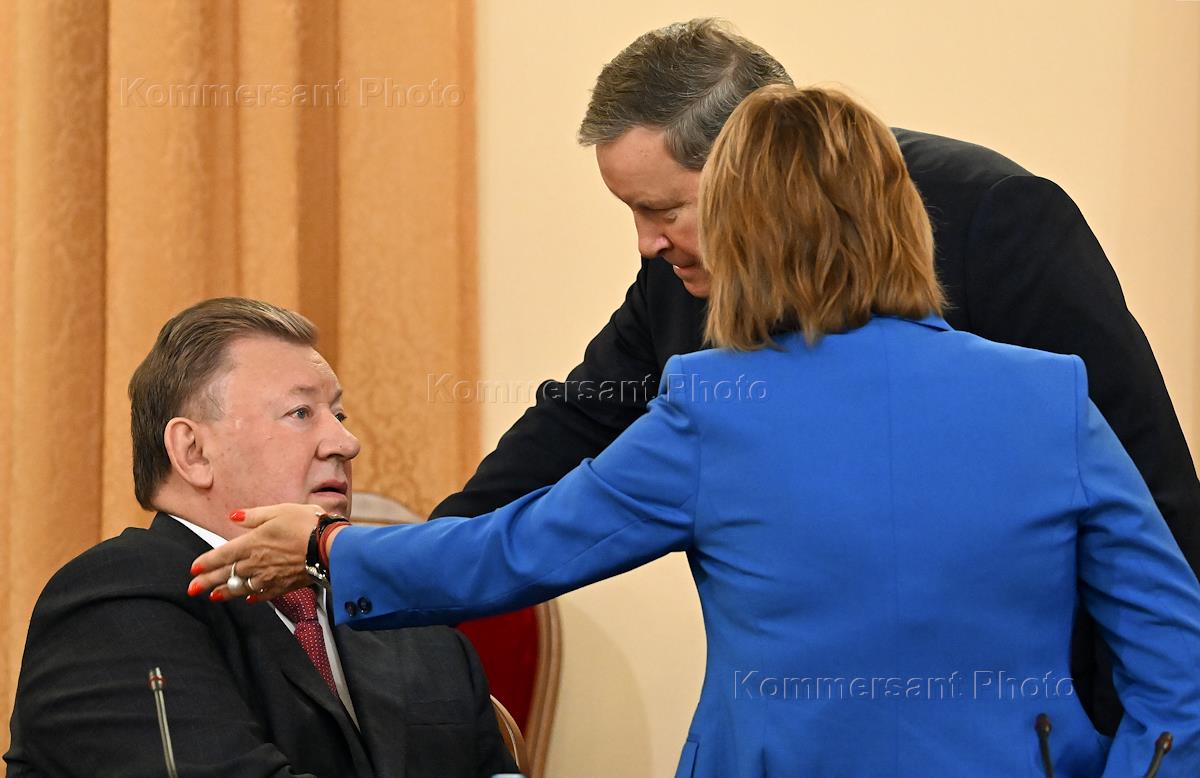 Расширенное заседание комитета Государственной думы (ГД) России по аграрным вопросам с участием Министра сельского хозяйства России Оксаны Лут на тему "О национальном докладе о ходе и результатах реализации Государственной программы развития сельского хозяйства и регулирования рынков сельскохозяйственной продукции, сырья и продовольствия" в ГД России. Слева направо: председатель комитета ГД России по аграрным вопросам Владимир Кашин, первый заместитель председателя комитета ГД России по аграрным вопросам Олег Нилов и первый заместитель министра сельского хозяйства России Елена Фастова после заседания.
