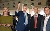 Ярмарка современного академического искусства "Арт Россия. Классика. Новый взгляд" в Гостином Дворе. Церемония открытия. Слева направо: сооснователь ярмарки Art Russia, искусствовед Елизавета Фролова, председатель Либерально-демократической партии России (ЛДПР), руководитель фракции ЛДПР в Государственной думы России Леонид Слуцкий, президент Корпорации "Синергия" Вадим Лобов и генеральный директор Общества "Знание" Максим Древаль на церемонии.