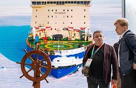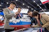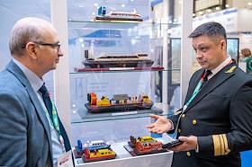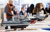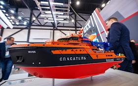 8-ая Международная выставка и конференция по гражданскому судостроению, судоходству, деятельности портов, освоению океана и шельфа "НЕВА 2025" в конгрессно-выставочном центре "Экспофорум". Жанровая фотография. Макет спасательного судна на стенде ОСК.