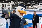 8-ая Международная выставка и конференция по гражданскому судостроению, судоходству, деятельности портов, освоению океана и шельфа "НЕВА 2025" в конгрессно-выставочном центре "Экспофорум". Жанровая фотография. Аниматор в костюме чайки на выставке.