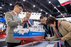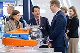 8-ая Международная выставка и конференция по гражданскому судостроению, судоходству, деятельности портов, освоению океана и шельфа "НЕВА 2025" в конгрессно-выставочном центре "Экспофорум". Жанровая фотография. Макет подводного судна на стенде ОСК.