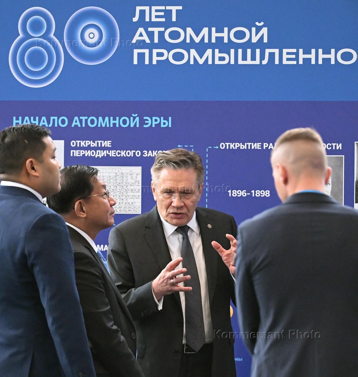 Международный форум "Мировая атомная неделя" на ВДНХ. Генеральный директор госкорпорации "Росатом" Алексей Лихачев (в центре) и исполняющий обязанности президента Мьянмы Мин Аун Хлайн (второй слева) на форуме.