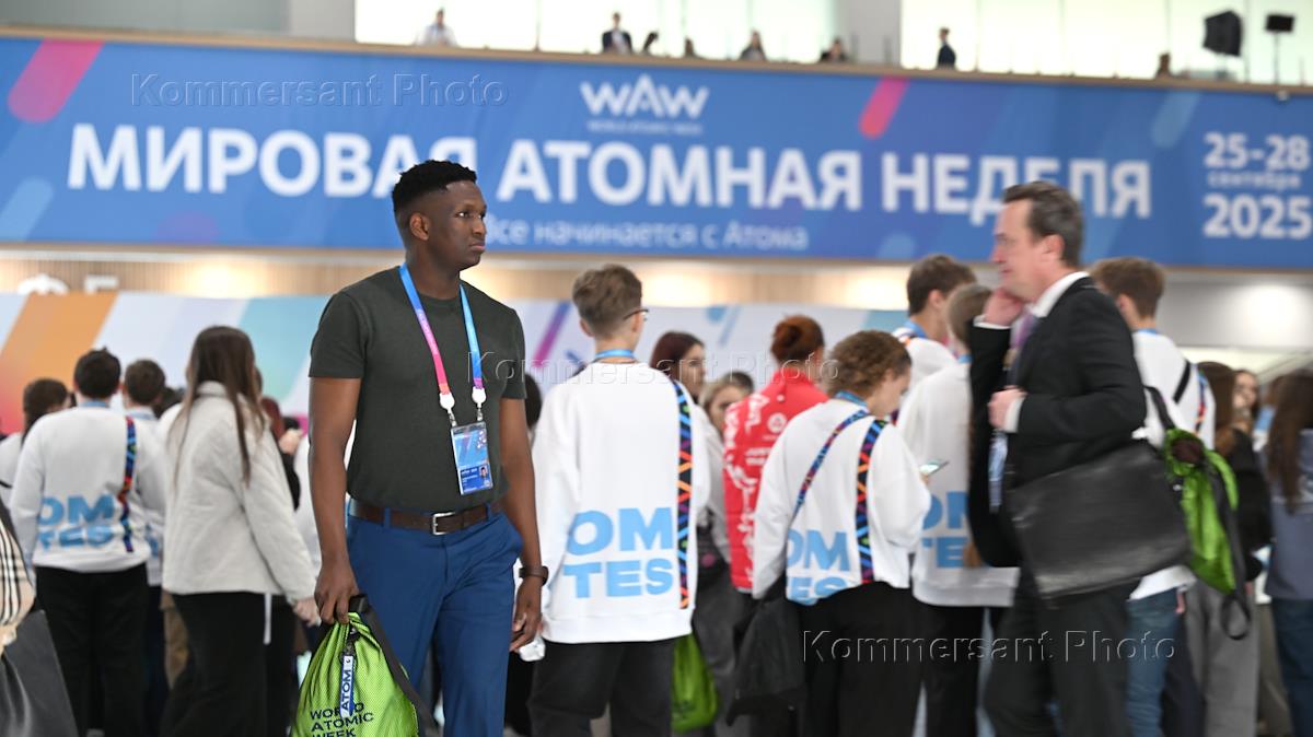 Международный форум "Мировая атомная неделя" на ВДНХ. Федеральный просветительский марафон "Знание. Первые", посвященный 80-летию атомной промышленности, в павильоне №57 "Россия — моя история". Жанровая фотография.