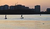 Виды вечернего Омска. Жанровая фотография. Люди катаются на сапах на реке Иртыш.