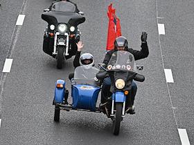 Московский мотофестиваль по случаю закрытия мотосезона на Воробьёвых горах. Руководитель департамента транспорта и развития дорожно-транспортной инфраструктуры города Москвы Максим Ликсутов (в центре) и начальник Главного управления по обеспечению безопасности дорожного движения (ГУОБДД) МВД России Михаил Черников (слева) перед началом мотопробега.