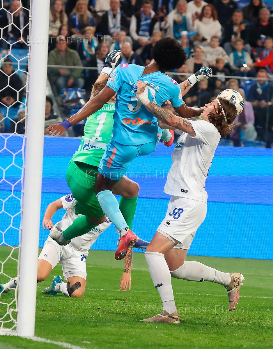 Мир Российская Премьер-Лига (РПЛ) 2025/2026. 10-й тур. Матч между командами "Зенит" (Санкт-Петербург) - "Оренбург" (Оренбург) на стадионе "Газпром Арена". Вратарь команды "Оренбург" Богдан Овсянников (справа) во время матча.