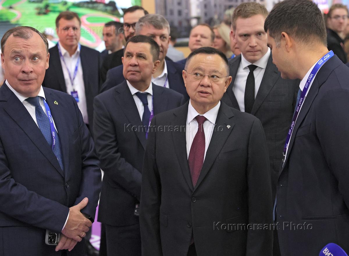 XII Международный строительный форум и выставка "100+ TechnoBuild" на площадке Международного выставочного центра (МВЦ) "Екатеринбург-ЭКСПО". Министр строительства и жилищно-коммунального хозяйства России Ирек Файзуллин (второй слева) и мэр Екатеринбурга Алексей Орлов (справа) во время осмотра выставки.
