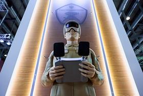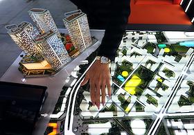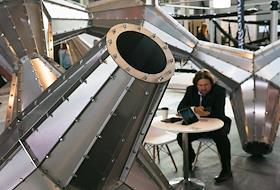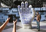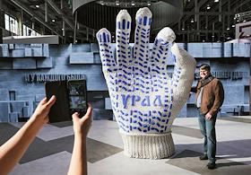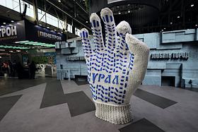 Международная строительная выставка "100+ TechnoBuild" в МВЦ "Екатеринбург-ЭКСПО". Жанровая фотография. Арт-объект в виде трехметровой хозяйственной перчатки, который хотят установить в Екатеринбурге.