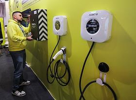 Международная строительная выставка "100+ TechnoBuild" в МВЦ "Екатеринбург-ЭКСПО". Жанровая фотография. Стенд заправщиков электроавтомобилей.