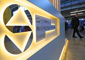 XII Международный строительный форум и выставка "100+ TechnoBuild" на площадке Международного выставочного центра (МВЦ) "Екатеринбург-ЭКСПО". Жанровая фотография. Стенд Щербинского лифтостроительного завода.