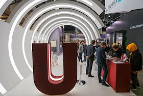 XII Международный строительный форум и выставка "100+ TechnoBuild" на площадке Международного выставочного центра (МВЦ) "Екатеринбург-ЭКСПО". Жанровая фотография. Стенд компании "Алютех" на выставке.