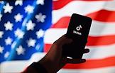 Жанровая фотография. Мобильное приложение Tik Tok на экране мобильного телефона на фоне флага США.