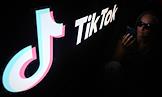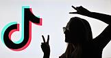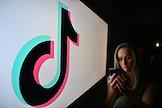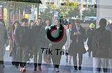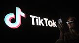 Жанровая фотография. Логотип мобильного приложения Tik Tok на телевизионном экране. Девушка с мобильным телефоном у экрана.