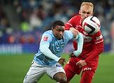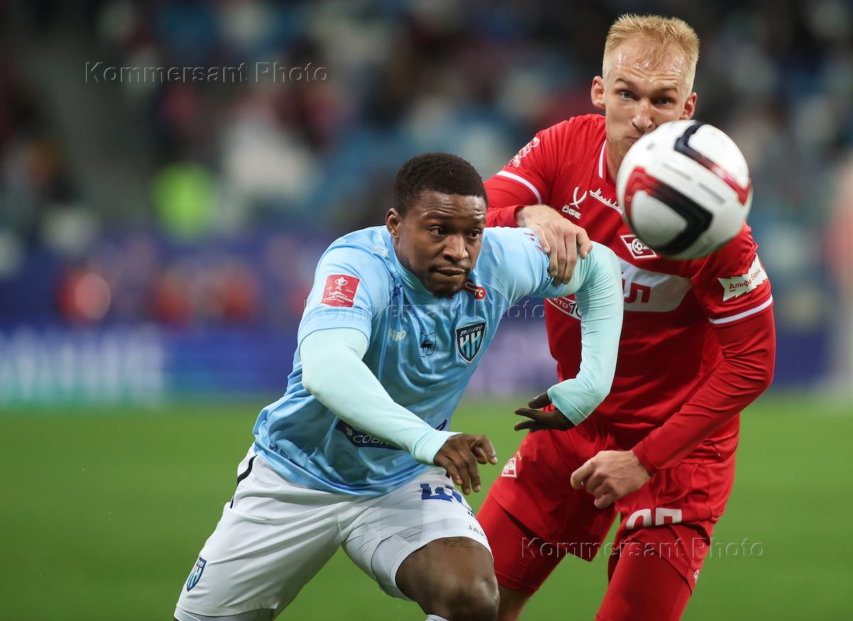 Фонбет - Кубок России по футболу 2025/26. 5-й Тур. Матч между командами "Пари Нижний Новгород" (Нижний Новгород) - "Спартак" (Москва) на стадионе "Совкомбанк Арена". Игрок команды "Пари Нижний Новгород" Олакунле Олусегун (слева) и игрок команды "Спартак" Даниил Денисов (справа) во время матча.