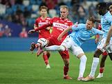 Фонбет - Кубок России по футболу 2025/26. 5-й Тур. Матч между командами "Пари Нижний Новгород" (Нижний Новгород) - "Спартак" (Москва) на стадионе "Совкомбанк Арена". Игрок команды "Пари НН" Вадим Пигас (слева) и игрок команды "Спартак" Олег Рябчук (справа) во время матча.