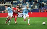 Фонбет - Кубок России по футболу 2025/26. 5-й Тур. Матч между командами "Пари Нижний Новгород" (Нижний Новгород) - "Спартак" (Москва) на стадионе "Совкомбанк Арена". Игрок команды "Спартак" Пабло Солари (слева) и игроки команды "Пари Нижний Новгород" Ярослав Крашевский (в центре) и Валерий Царукян (справа) во время матча.