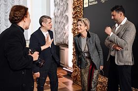 Презентация книги писателя Льва Данилкина "Палаццо мадамы: воображаемый музей Ирины Антоновой" в Доме Пашкова. Телеведущая Сати Спивакова (слева) и директор Департамента государственной поддержки периодической печати и книжной индустрии Министерства цифрового развития, связи и массовых коммуникаций России Владимир Григорьев (справа) на презентации.