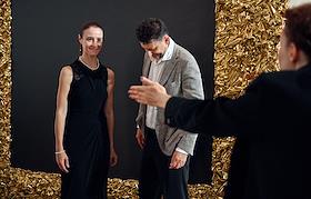 Презентация книги писателя Льва Данилкина "Палаццо мадамы: воображаемый музей Ирины Антоновой" в Доме Пашкова. Актриса Ксения Лаврова-Глинка (слева) и писатель Лев Данилкин (справа) на презентации.