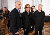 Презентация книги писателя Льва Данилкина "Палаццо мадамы: воображаемый музей Ирины Антоновой" в Доме Пашкова. Справа налево: Искусствовед, арт-менеджер Михаил Каменский, художник, архитектор Юрий Аввакумов и писатель Лев Данилкин на презентации.