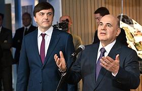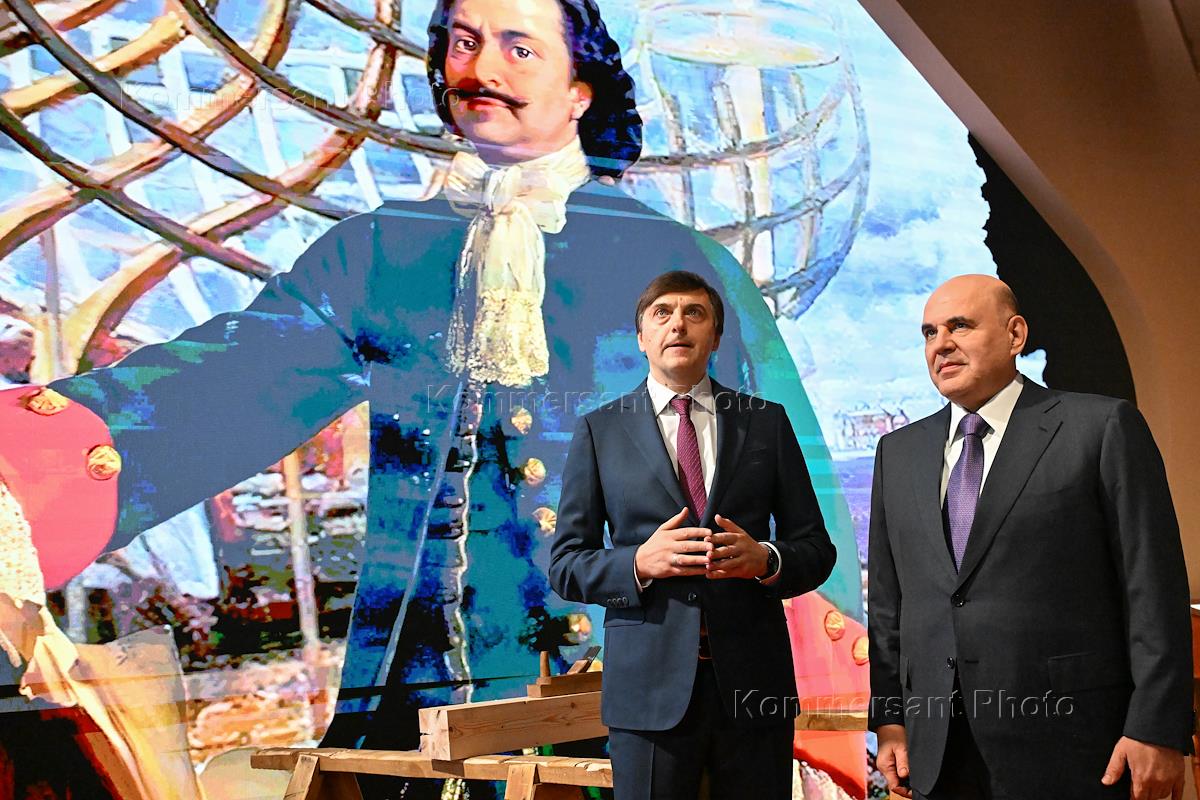 Председатель правительства России Михаил Мишустин (справа) и министр просвещения России Сергей Кравцов (слева) во время посещения выставки "85 лет системе СПО: сила в мастерстве!" на территории национального центра "Россия".
