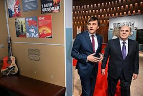 Министр просвещения России Сергей Кравцов (слева) и его заместитель Владимир Желонкин (справа) во время посещения выставки "85 лет системе СПО: сила в мастерстве!" на территории национального центра "Россия".
